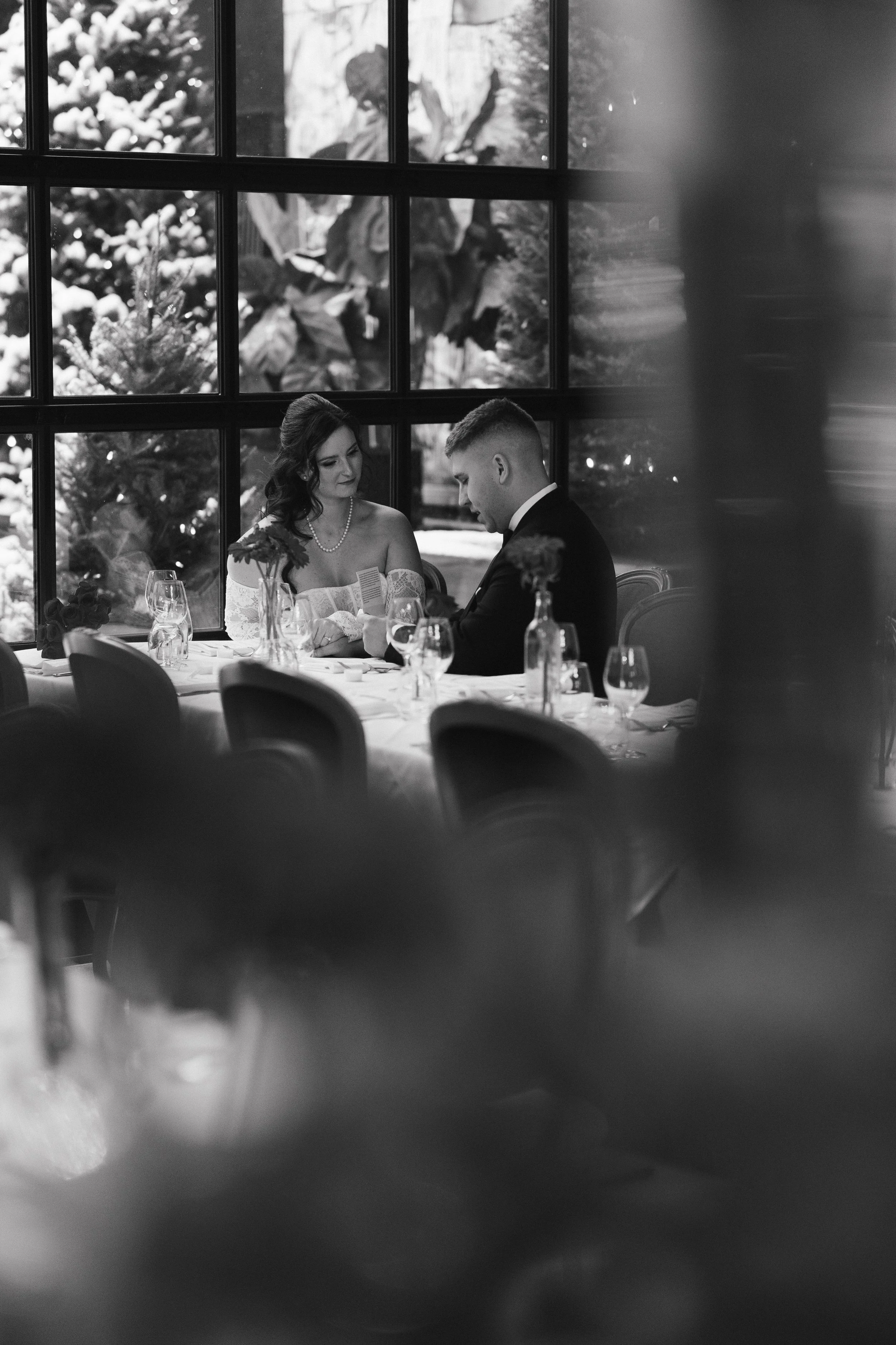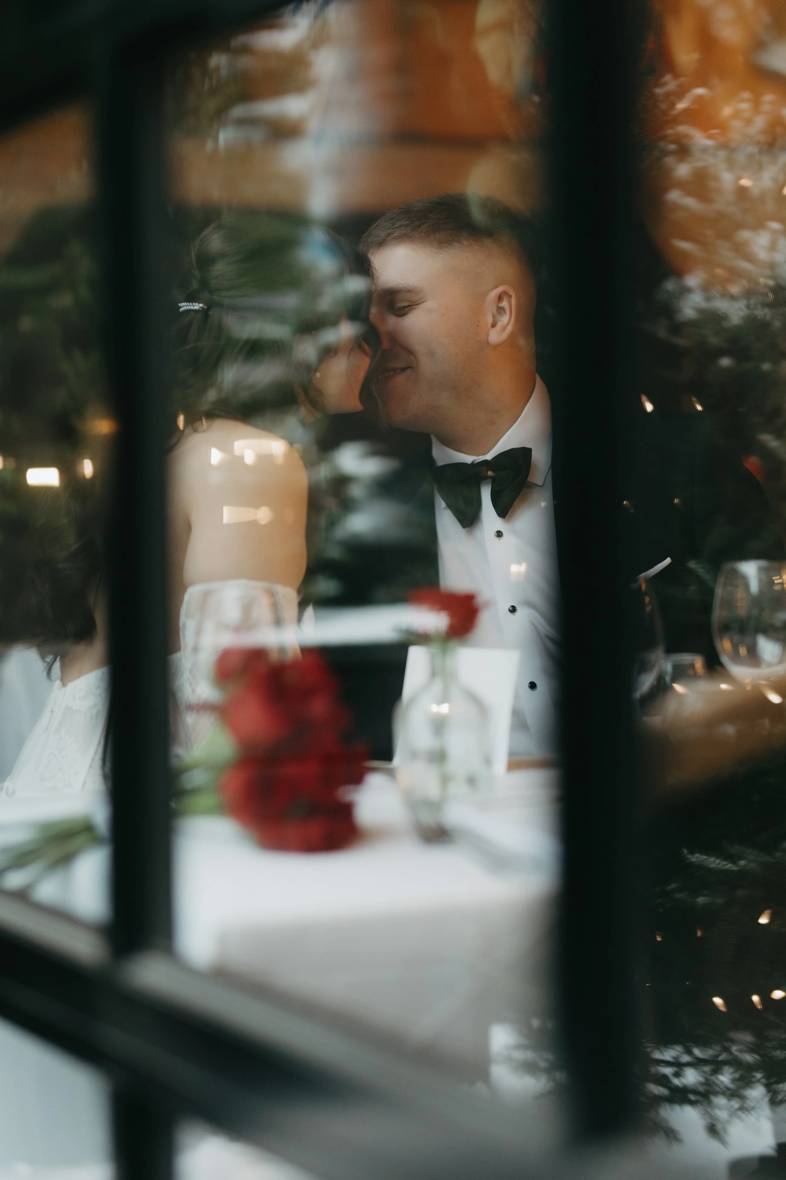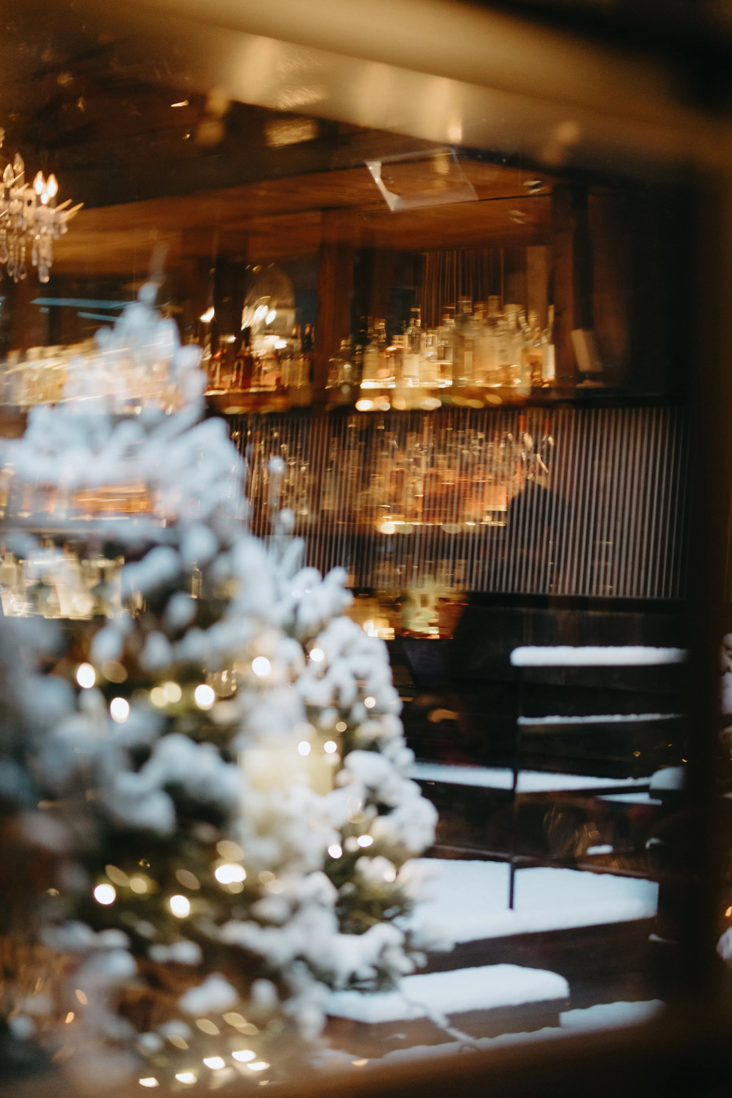 It was one of those true December days, soft snow falling outside, the city wrapped in white, and guests arriving with rosy cheeks from the cold. Inside, everything felt warm and intimate. Candlelight reflected off glassware, evergreen touches added that subtle Christmas feel, and the whole room glowed with cozy elegance.
