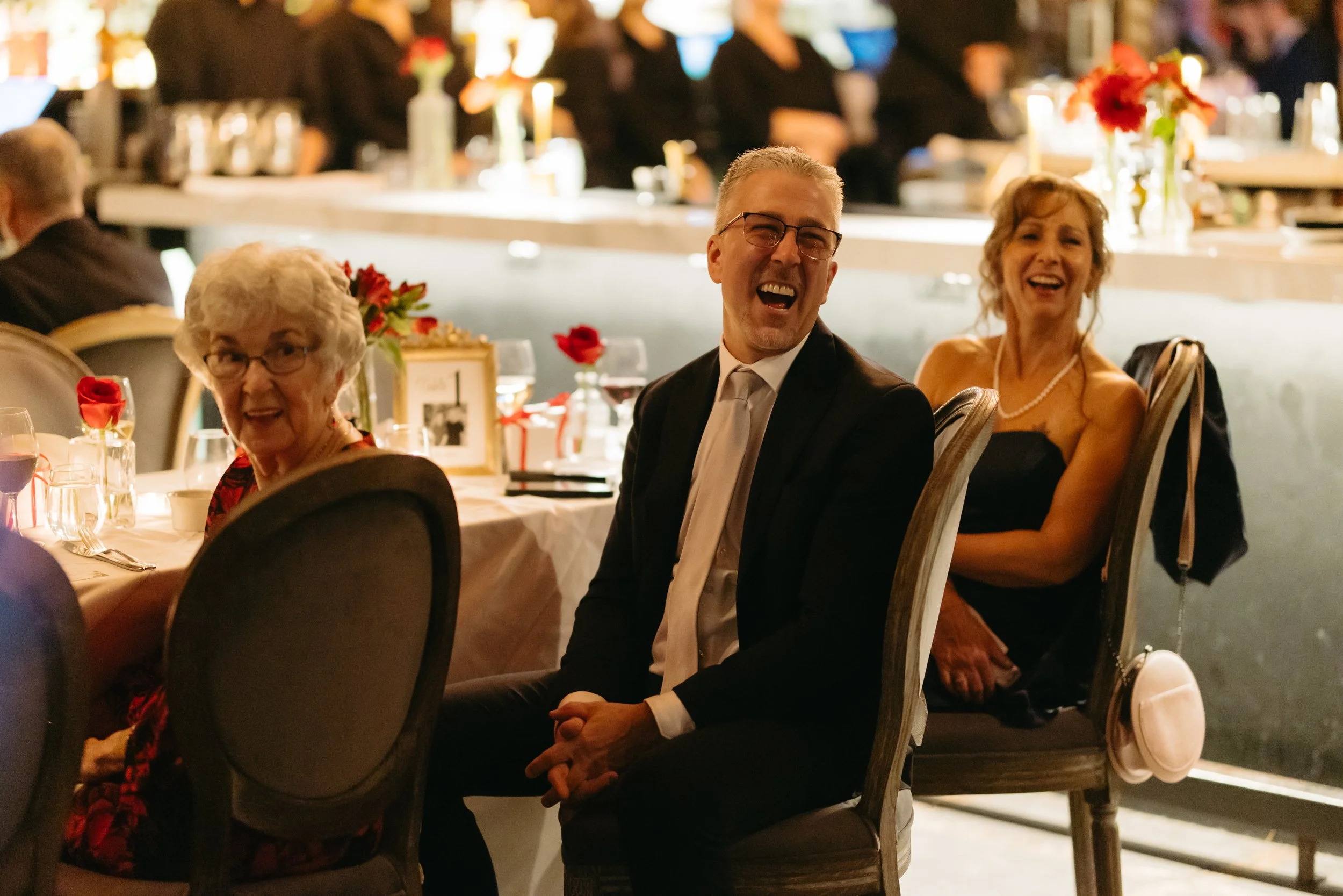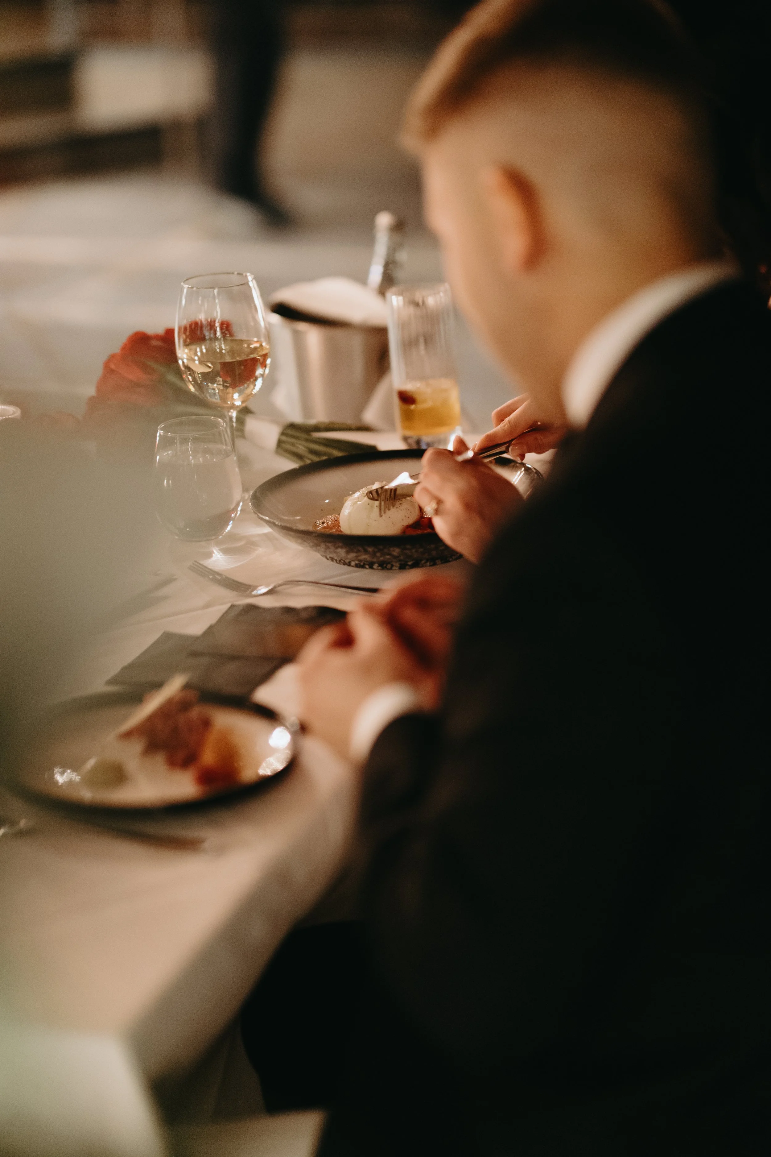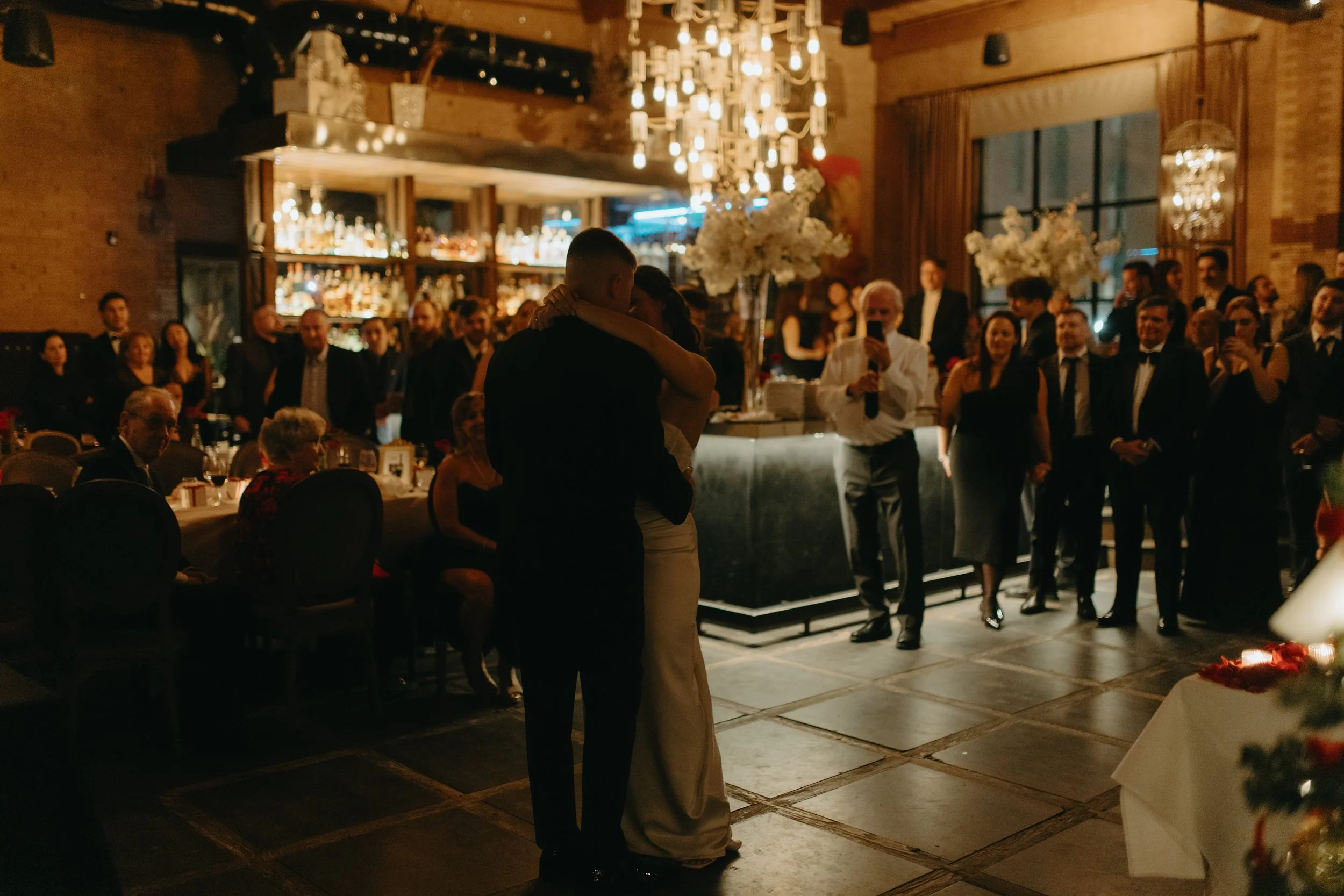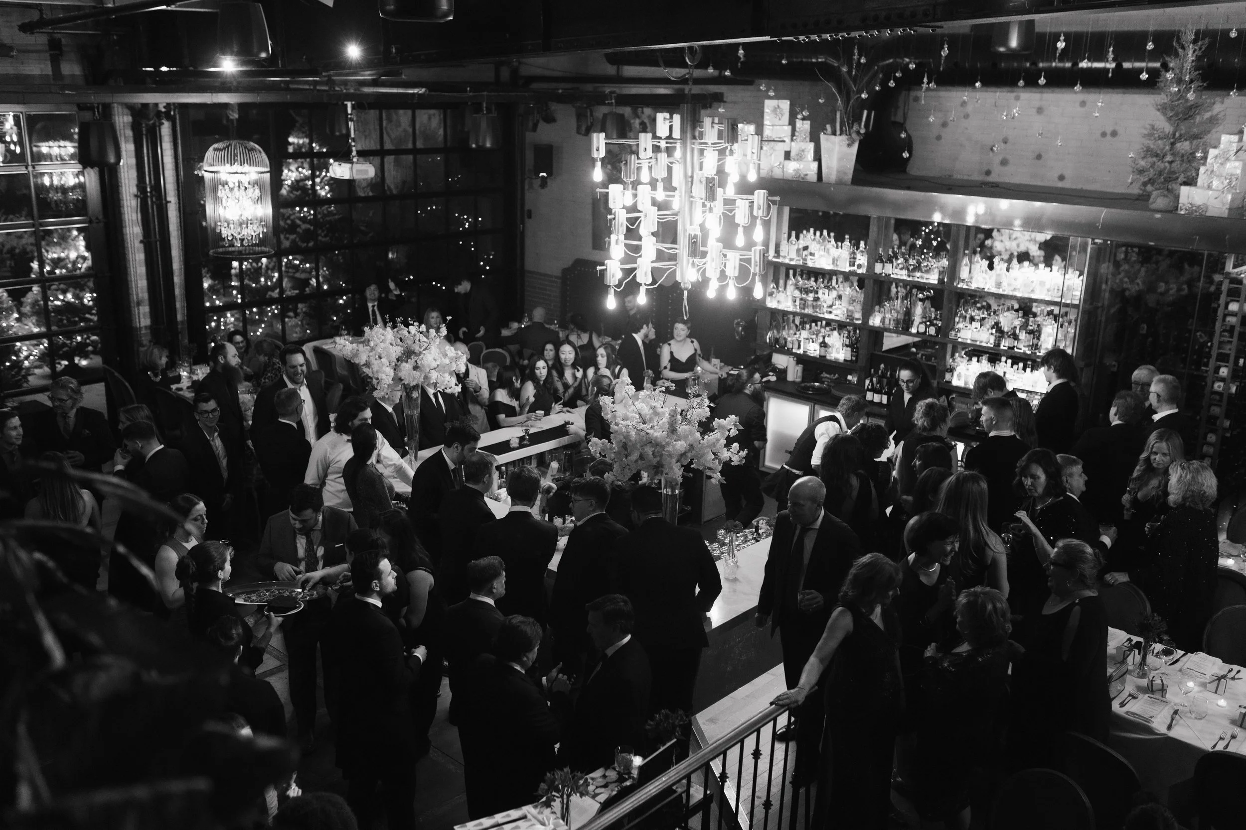 It was one of those true December days, soft snow falling outside, the city wrapped in white, and guests arriving with rosy cheeks from the cold. Inside, everything felt warm and intimate. Candlelight reflected off glassware, evergreen touches added that subtle Christmas feel, and the whole room glowed with cozy elegance.